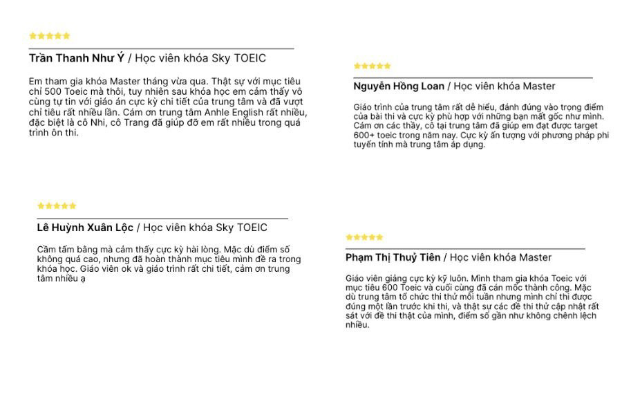 “Những kì thi thử và cả đề luyện tập của Anh Lê Toeic đều sát với nội dung của những bài thi thật, giúp học viên luyện tập thật tốt và làm quen dần với các đề thi chính thức. Từ đó tạo tâm lý yên tâm và tự tin cho học viên của trung tâm"”- đại diện Anh Lê English cho biết.