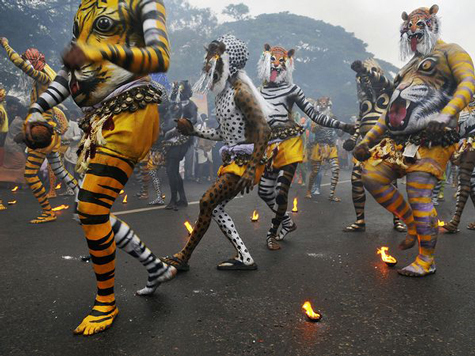 Các họa sỹ múa hổ trên đường phố Mumbai trong ngày hội thứ tư của lễ hội Onam, lễ hội gặt hái ở Kerala, Ấn Độ. “Hình ảnh các gã chàng trai có bụng bự có hình sơn hổ náo nhiệt và hỗn tạp làm cho bức ảnh đạt hiệu quả mạnh về hình ảnh.”