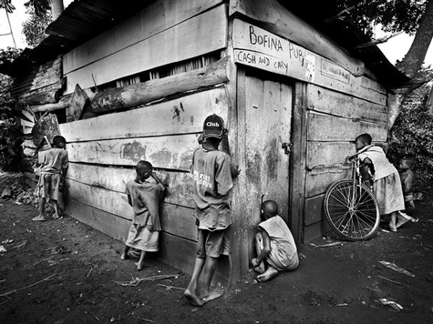 Những đứa trẻ chân đất nhòm vào quán rượu Bofina ở Kybira, Uganda. Bức hình chụp bởi Leslie Alsheimer người Mỹ. Sự tò mò của những đứa trẻ là điểm hấp dẫn của bức hình.