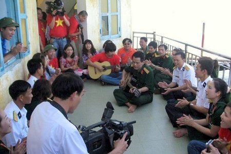 Tôi và anh Hồng Kỳ QK4 lại mỗi anh em một cây đàn để đảm nhận phần nhạc. Phần ca hát thì cứ sau một người bên chúng tôi hát sẽ lại có một người bên lính đảo Cô Lin hát "đáp lễ". Cao hứng thì hai bên cùng "song phi", à quên, song ca, một bài cho vui.