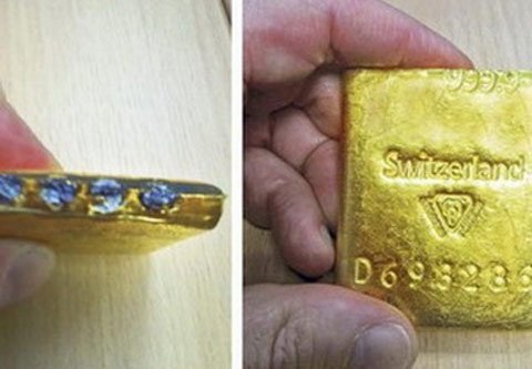 Hoạt động làm giả vàng thỏi này đã được phát hiện tại châu Á, tuy nhiên, lần đầu tiên tại Anh, người ta phát hiện ra một thỏi vàng bị làm giả như thế này.