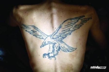 Thời tiết oi bức, Wu cởi bỏ chiếc áo ngoài để lộ hình xăm trổ đại bàng trên lưng.