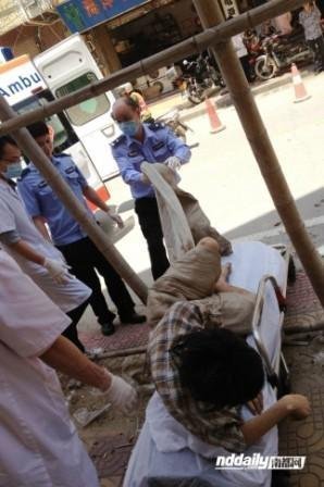 Cảnh sát và các nhân viên y tế đưa Wu lên cáng.