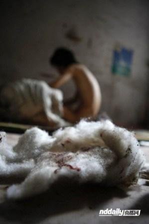 Wu không mặc quần áo, chán nản ngồi một mình trong nhà. Những miếng bông dính máu vứt rải rác khắp sàn.