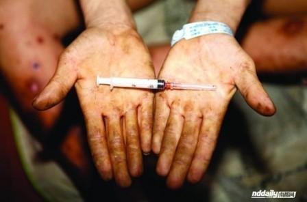 Wu tự tiêm chích trong phòng. Hai chân đầy vết nhiễm trùng, lở loét.