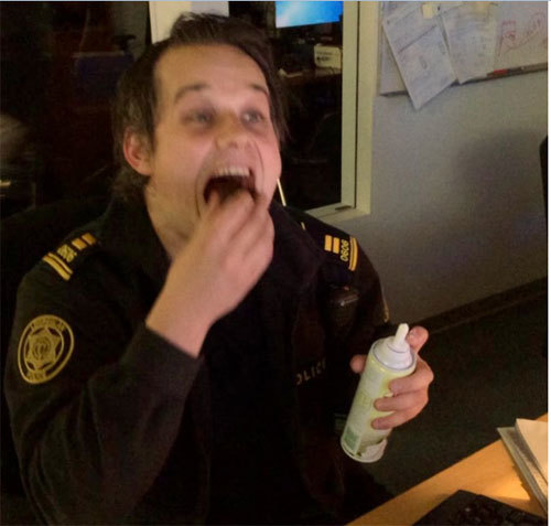 Trong một tấm ảnh, một cảnh sát đang đổ kem tươi vào miệng trước khi đổi ca trực đêm. Trong một ảnh khác, một viên cảnh sát lại thực hiện màn nhào lộn bằng ván trượt hay đeo mũi đỏ, mặt nạ lợn.