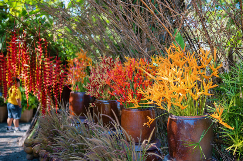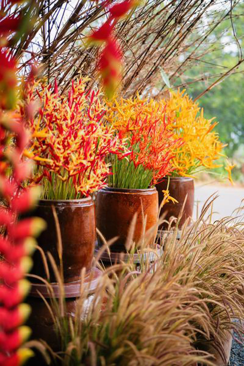 50 chiếc lu chứa nước mưa được xếp ngay ngắn ở lối đi và được dùng làm bình cắm hoa thiên điểu, cỏ mỹ