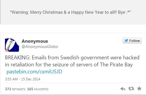 Twitter của Anonymous thông báo: email của chính phủ Thụy Điển đã bị tấn công để trả thù vụ triệt hạ máy chủ của The Pirate Bay
