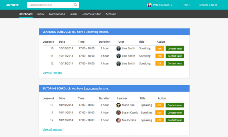 Antoree ra đời để giải quyết nhu cầu này của thị trường, người có nhu cầu tìm giáo viên dạy tiếng Anh có thể tìm kiếm trong danh sách hàng nghìn giáo viên trên hệ thống với những thông tin cơ bản như tên giáo viên, giá tiền, đánh giá của những học viên trước về giáo viên đó. Nếu cảm thấy phù hợp, học viên sẽ tiến hành gửi yêu cầu đến giáo viên để tiến hành việc học của mình. Đặc biệt, học viên có thể tham gia những bài học thử để tự đánh giá trình độ của giáo viên trước khi quyết định đóng học phí. Việc quản lý cũng như thông tin chi tiết các lớp học mà học viên đang tham gia cũng rất đơn giản và tiện lợi.