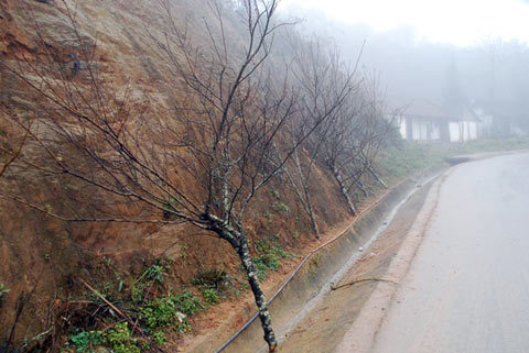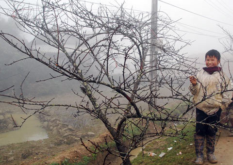 Dọc quốc lộ 4D, từ thành phố Lào Cai lên Sa Pa, rất nhiều người lớn, trẻ em Mông đứng bán hoa đào núi.