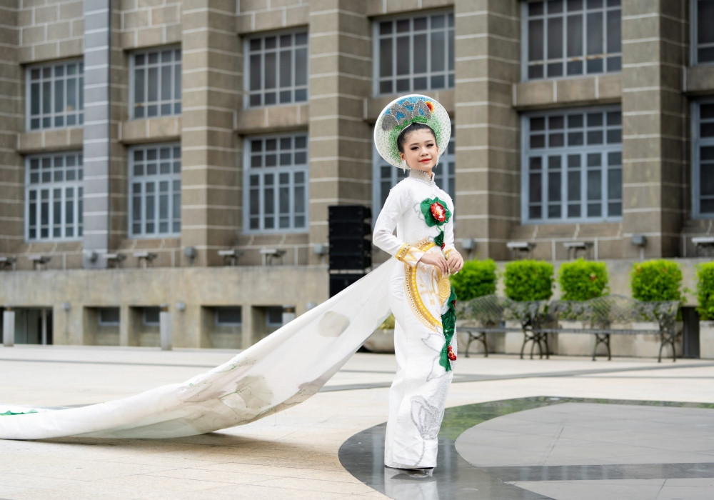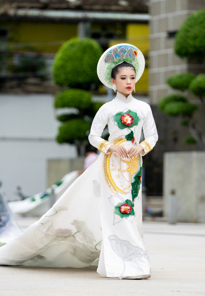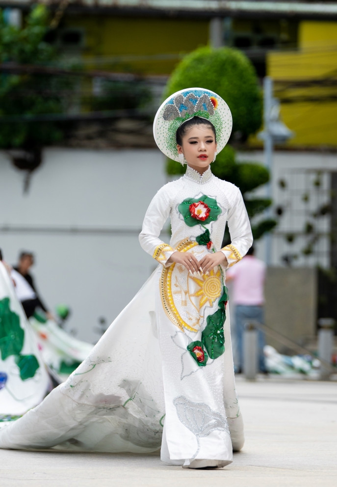 Chiếc áo dài Non sông gấm vóc nặng 250kg từng đạt Kỷ lục Việt Nam được trình diễn trên đất Thái Lan. Katherine Minh Vy tái hiện phần trình diễn này.