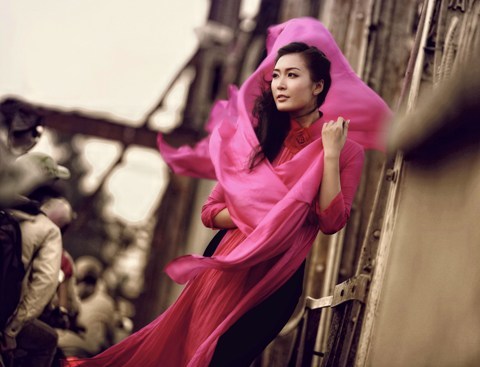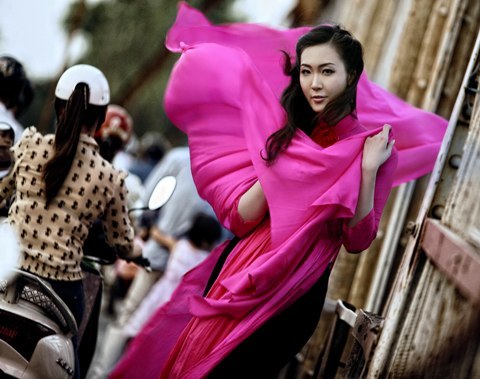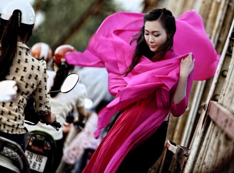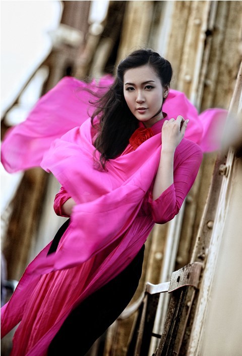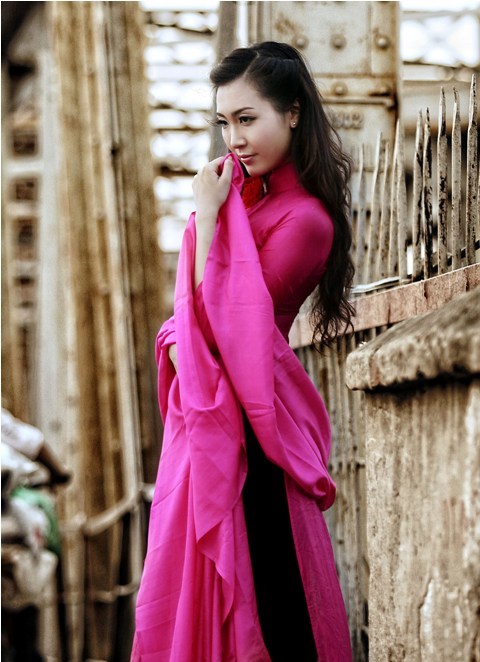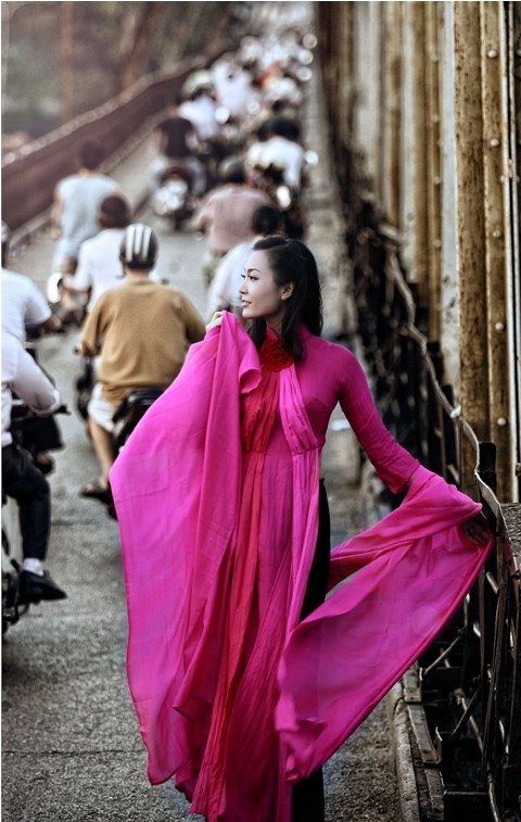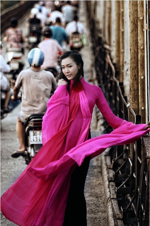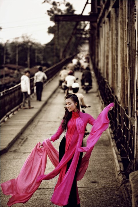 Thùy Trang - Á hậu Việt Nam 2010 rất duyên dáng và ngọt ngào trong tà áo dài đậm sắc sen hồng. Nhiếp ảnh gia đã khéo léo xử lý ánh sáng để cầu Long Biên trở nên xưa cũ hơn, cổ kính hơn, làm nổi bật lên hình dáng thiếu nữ và tà áo dài rực rỡ.