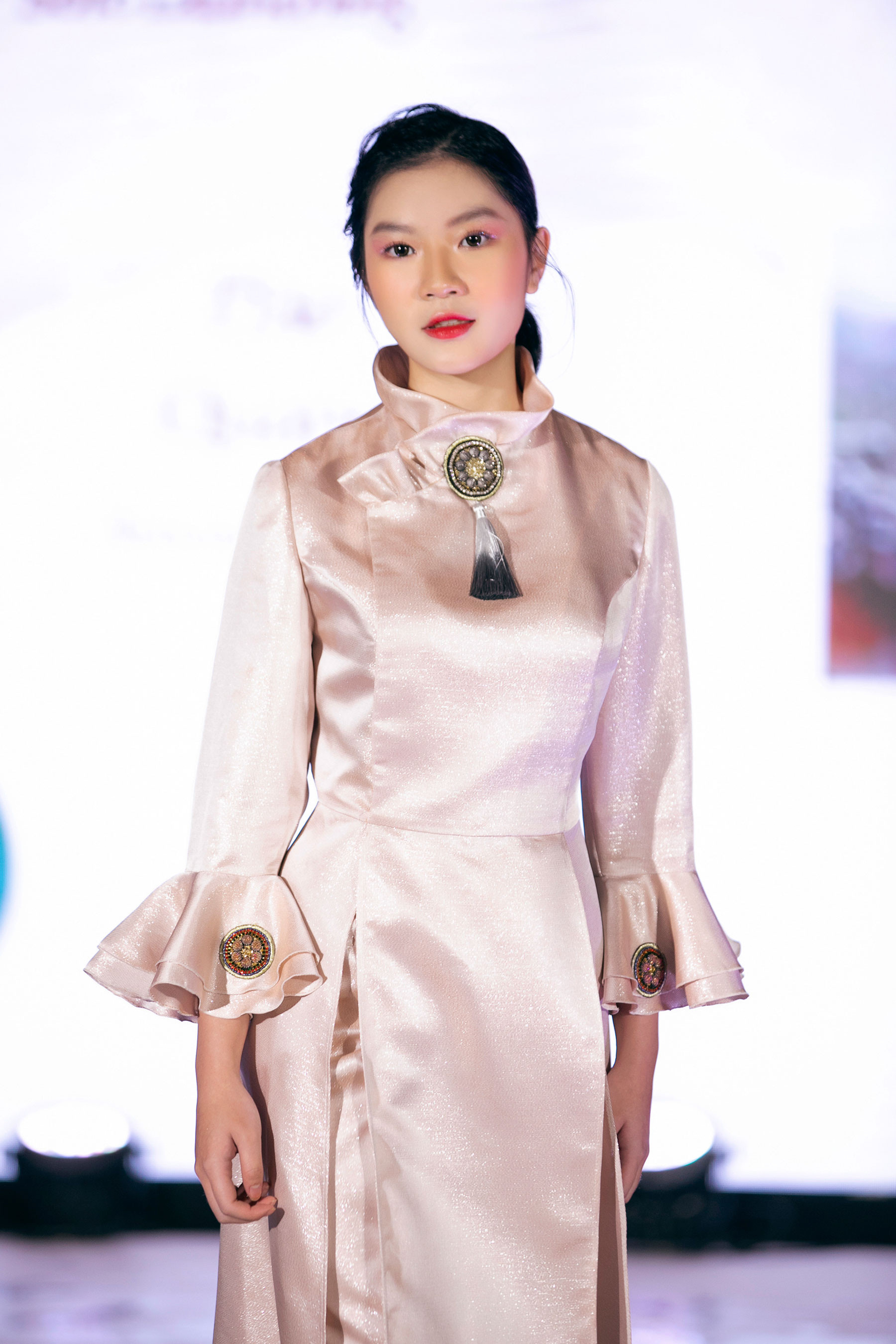5 tác phẩm áo dài của NTK Quang Hoà là sự gìn giữ, tôn vinh nét duyên dáng, nét cổ điển, sang trọng, vừa phảng phất vẻ hiện đại, tinh tế của tà áo dài truyền thống. Trên chất liệu lụa cát, với công nghệ in hiện đại và kỹ thuật may tinh xảo, những nét vẽ mềm mại cùng tone màu đặc trưng của Huế được thể hiện sinh động, có chiều sâu.