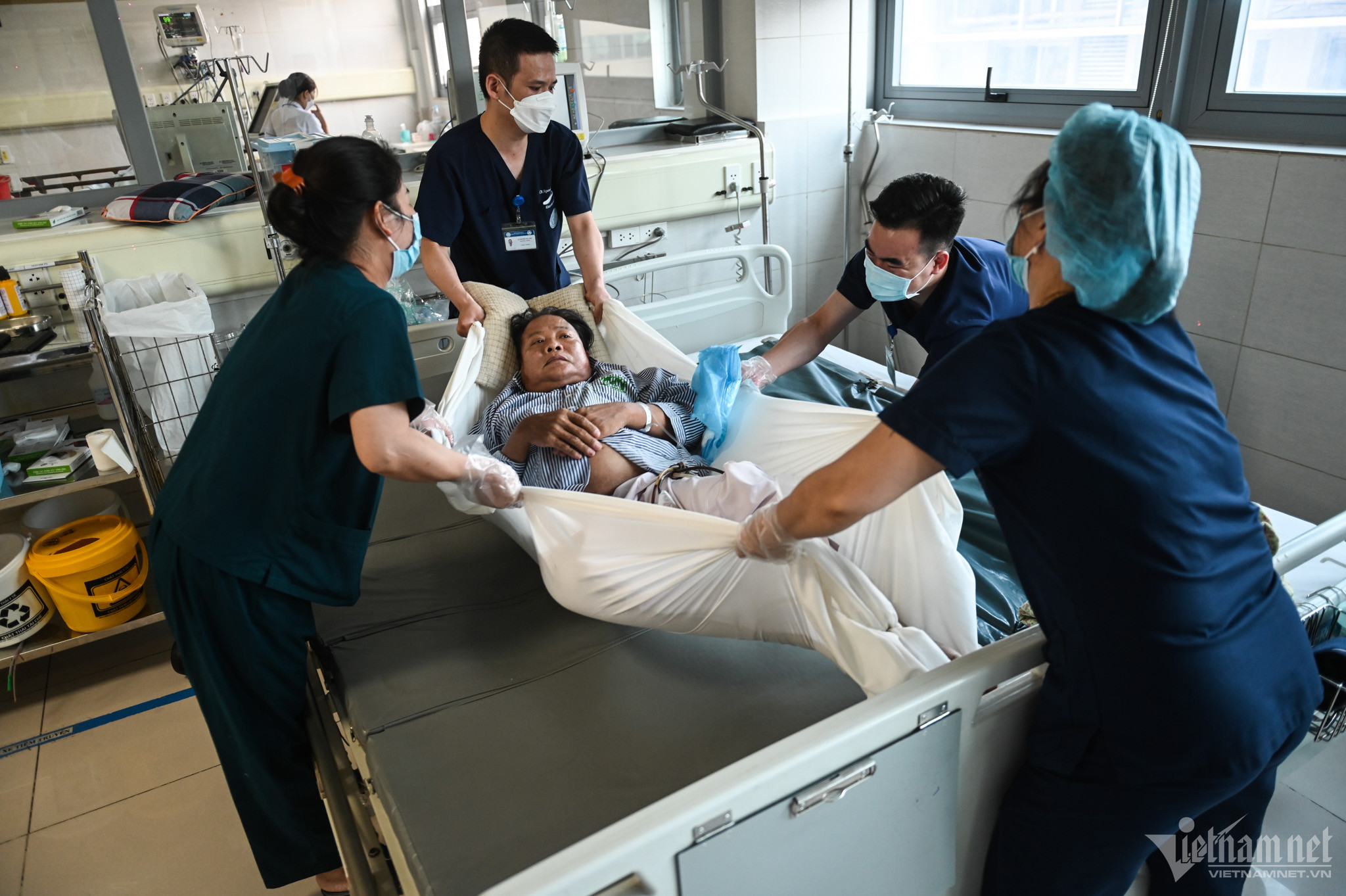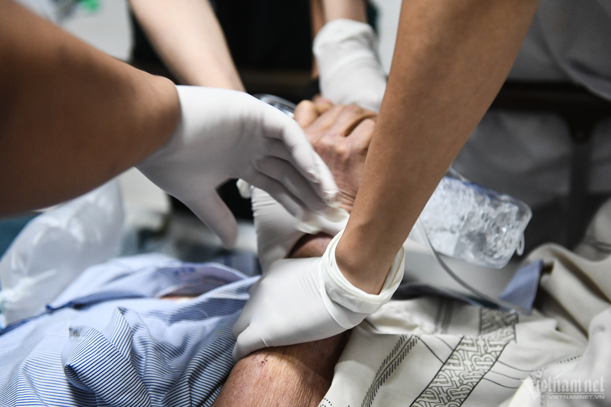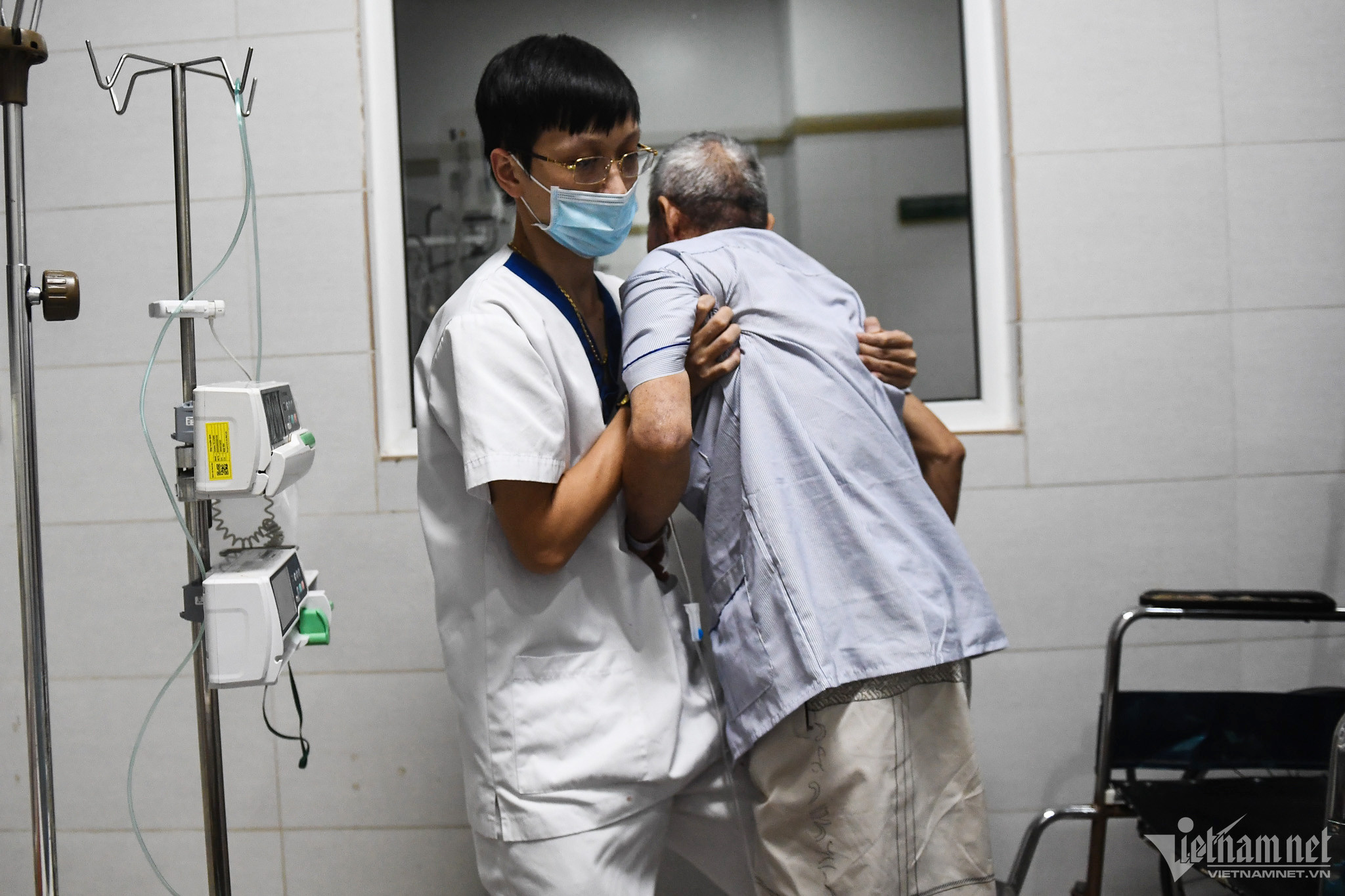 "Anh Nam ơi, anh Nam, giúp em", Lê thò đầu ra cửa phòng, gọi với. Một vài điều dưỡng bỏ lại công việc đang dở tay chạy vào. Người đàn ông lớn tuổi vẫn giãy dụa không hợp tác. Điều dưỡng Nam ghì lấy tay ông. Dáng người to lớn của anh, thêm sự giúp sức của 2-3 người nữa vẫn không ăn thua.