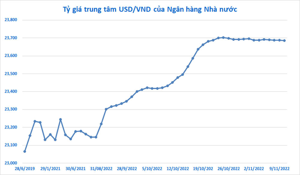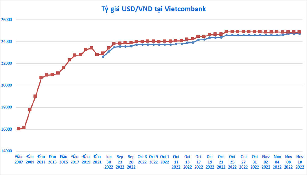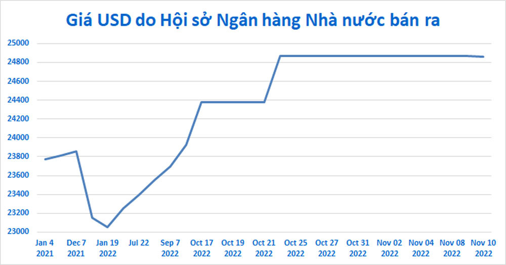 Trong suốt gần 10 tháng trước đó, NHNN chỉ có tăng hoặc giữ nguyên giá bán USD tại Sở Giao dịch NHNN. Mức tăng được điều chỉnh từ 23.050 đồng/USD hôm 19/1 lên 23.400 đồng/USD hồi cuối tháng 8, lên 23.700 đồng/USD hôm 6/9, và 23.925 đồng vào ngày 30/9, 24.380 đồng/USD hôm 17/10 trước khi lên đỉnh 24.870 đồng/USD từ 24/10 cho tới 9/11.