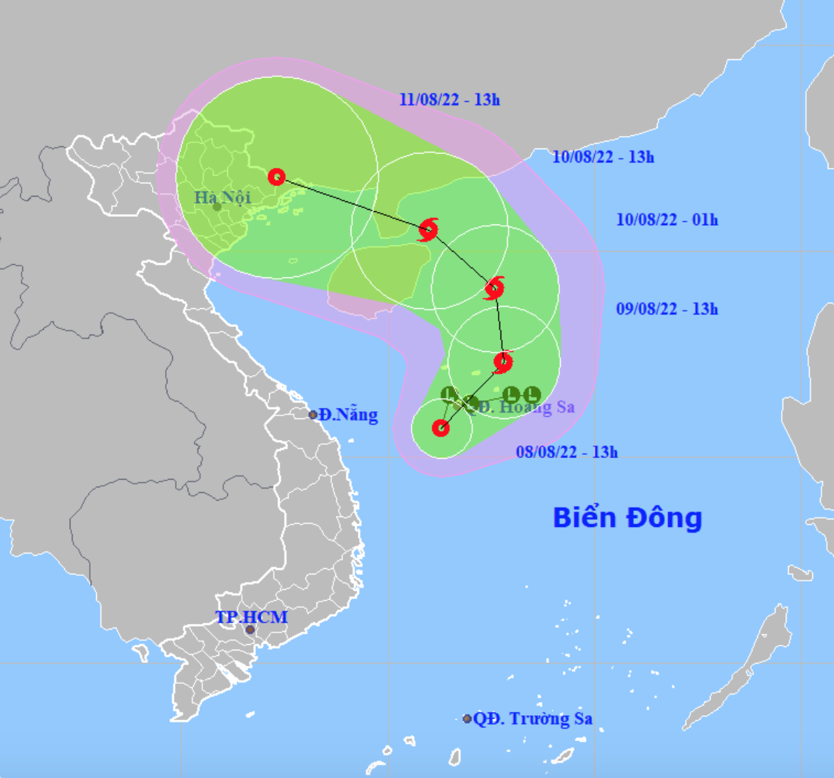 Đến 13h ngày 9/8, vị trí tâm bão ở khoảng 17,3 độ Vĩ Bắc; 112,8 độ Kinh Đông, trên khu vực phía Đông Bắc quần đảo Hoàng Sa. Sức gió mạnh nhất vùng gần tâm bão mạnh cấp 8 (62-74km/giờ), giật cấp 10.