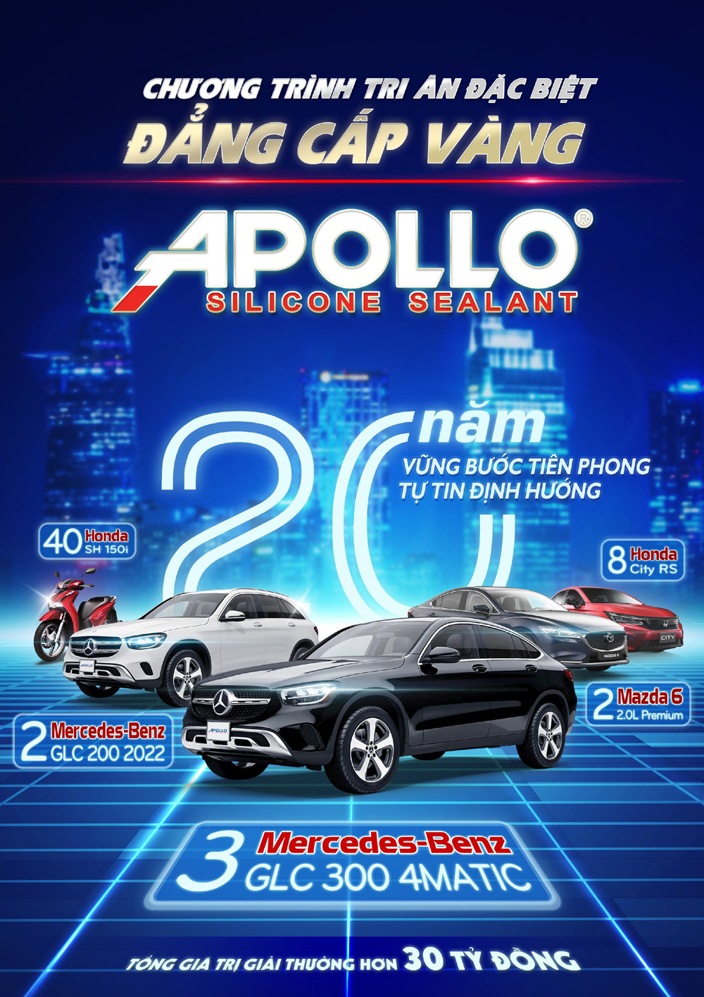 Hướng tới ngày truyền thống kỷ niệm 20 năm phát triển bền vững của Apollo Silicone 15/06/2023, Apollo Silicone quyết định xây dựng chương trình tri ân đặc biệt cho các nhà phân phối với các phần thưởng hấp dẫn và đẳng cấp, gồm: 3 xe ô tô Mercedes-Benz GLC 300; 2 xe ô tô Mercedes-Benz GLC 200; 2 xe ô tô Mazda 6 2.0L Premium; 8 xe ô tô Honda City RS và 40 xe gắn máy Honda SH 150i. Tổng giá trị của chương trình lên đến hơn 30 tỷ đồng.