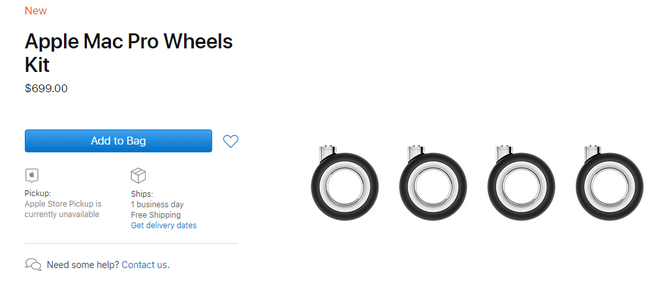 Nếu bạn mua một chiếc Mac Pro 2019 và lựa chọn đi kèm với bộ bánh xe, thì nó chỉ tốn của bạn thêm 400 USD cho bộ bánh xe này. Nhưng nếu bạn mua lẻ bộ bánh xe, với mục đích để thay thế cho những chiếc bánh xe cũ bị hỏng, nó sẽ có giá lên tới 699 USD, tương đương một chiếc iPhone 11.