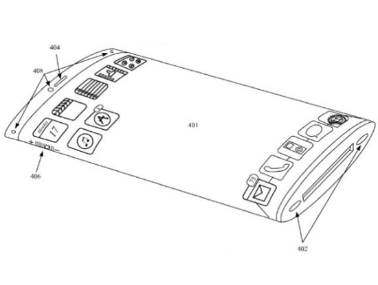 Những hình ảnh trong bằng sáng chế cho thấy một chiếc iPhone cong với màn hình bao quanh, cung cấp thêm diện tích để hiển thị tới 5 biểu tượng ứng dụng trên một hàng.