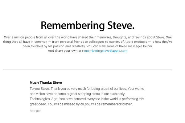 Mỗi năm, Apple lại tưởng nhớ đến Jobs theo nhiều cách vào ngày ông mất. Năm ngoái, Cook cũng gửi email đến toàn thể nhân viên. Năm 2012, Cook đăng một bức thư lên website của công ty. Và vào ngày sau khi Steve Jobs ra đi năm 2011, Apple đã cho ra một trang tưởng nhớ Steve Jobs trên trang chủ của hãng, trang tưởng nhớ này vẫn còn mãi đến ngày hôm nay. Nhiều người vẫn đang đăng lên đây những lời tưởng nhớ, cám ơn sâu sắc đến Steve Jobs. Trang web hầu như liên tục được cập nhật, liên tục có thêm những lời yêu thương và kính trọng dành cho Steve Jobs.
