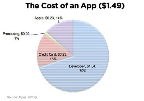 | Mặc dù đang ăn chia 3/7 với các bên phát triển ứng dụng, nhưng Apple chỉ nhận khoảng 14% trong 30% thu được. Nếu nhân với số tiền 2.6 tỉ USD mà Apple tuyên bố đã trả cho lập trình viên thì lợi nhuận từ AppStore cũng không thực sự lớn. |