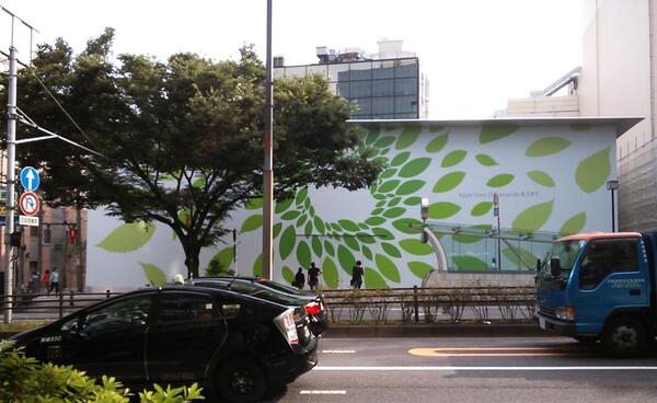 Ngoài ra, ngay trước công trình dở dang là tấm biển mô phỏng cơn mưa lá với dòng chữ “Apple Store, Omotesando sắp ra mắt”. Thiết kế này tương tự với biểu tượng chiếc lá xanh trong logo Apple vào ngày Trái Đất tháng trước.