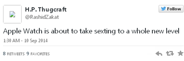 Đó là nhờ chiếc đồng hồ thông minh Apple Watch vừa được CEO Tim Cook công bố. Chiếc Watch mới của Apple có thể làm tất cả những thứ như gửi tin nhắn, chơi nhạc, theo dõi các hoạt động của cơ thể, Time Cook nói tại buổi lễ ra mắt hai mẫu iPhone 6 và Apple Watch. Tuy nhiên, theo trang Huffington Post, Cook đã xem thường một tính năng đặc biệt của Apple Watch: đó là thiết bị này rất có tiềm năng mang đến cuộc cách mạng cho sexting - sexting là từ ghép của Sex (tình dục) và Texting (nhắn tin). Có thể hiểu rằng đây là những tin nhắn liên quan đến tình dục.
