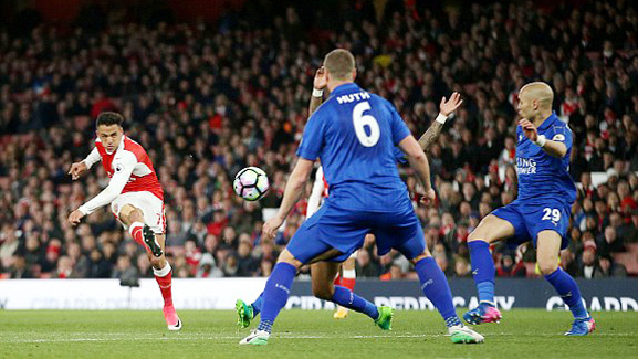 Coquelin dứt điểm tầm xa buộc Kasper Schmeichel phải trổ tài cứu thua.