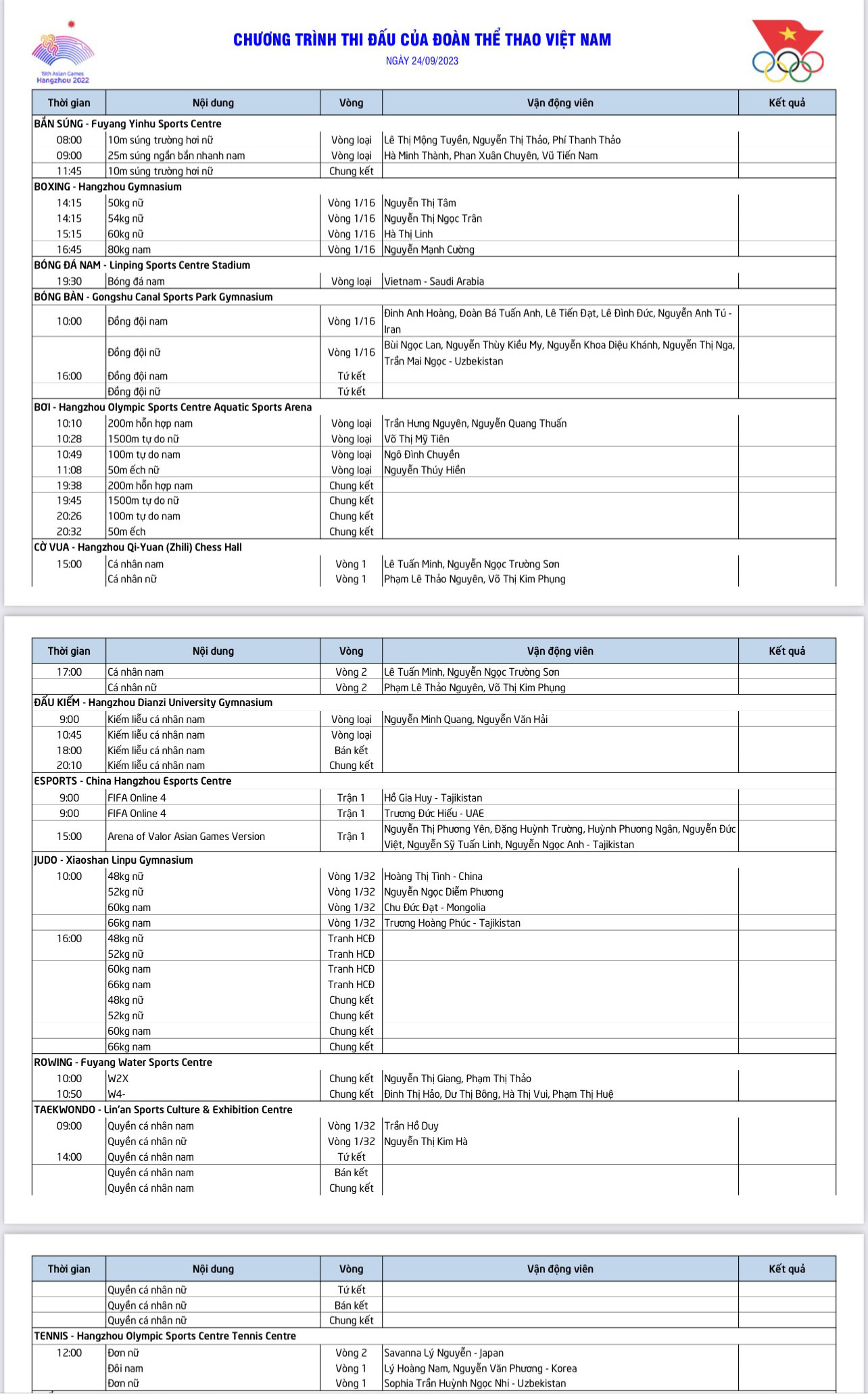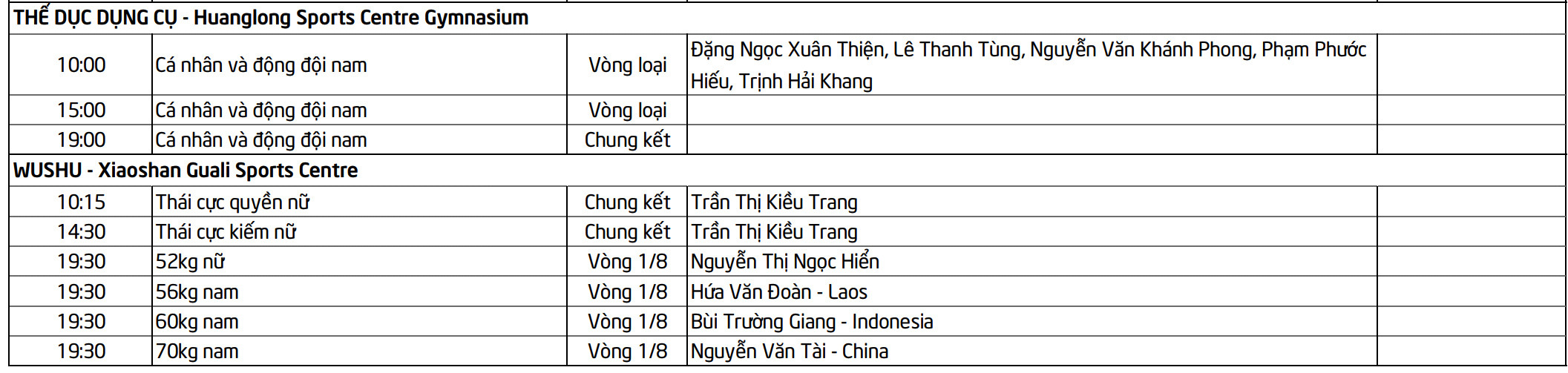 Ngoài ra, đoàn TTVN còn tranh tài ở các môn bóng bàn, tennis, Esports với các nội dung vòng loại.