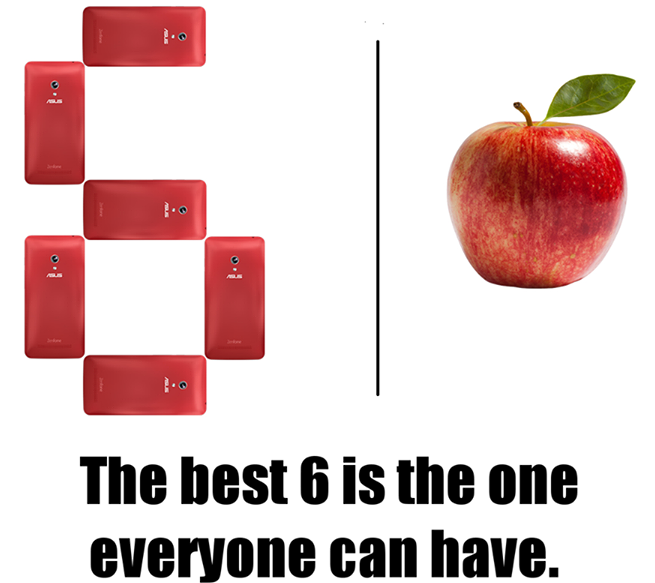 Asus chính là hãng nhanh chân nhất khi tung ra một mẫu quảng cáo nhằm nhắc người dùng rằng họ có thể mua đến 6 chiếc Zenfone thay cho chiếc iPhone 6 đắt tiền. Đi kèm với hình ảnh này là một câu hỏi đầy ẩn ý: "Số 6 nào là tốt hơn - 6 chiếc Zenfone cho các thành viên trong gia đình, hay một quả táo cho mỗi bạn?".