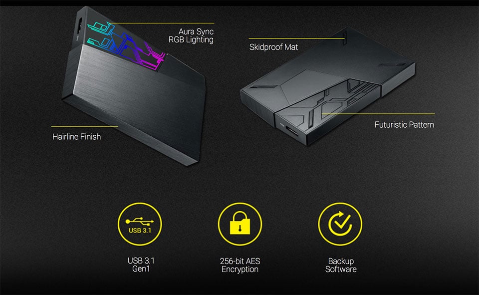- ASUS FX HDD là ổ cứng gắn ngoài 2.5" với hai mức dung lượng 1TB và 2TB và là ổ cứng gắn ngoài đầu tiên trên thế giới tích hợp công nghệ đèn màu Aura Sync RGB