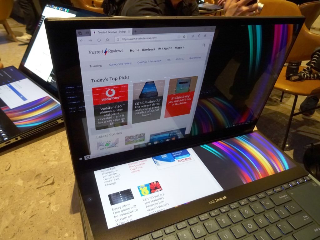 Chiếc ZenBook Pro Duo này không phải là một chiếc laptop thông thường. Trên chiếc laptop này sẽ được lắp đặt tới hai màn hình 4K. Một là màn hình cảm ứng OLED 16:9 có độ lớn 15,6 inch, giống với vị trí của các màn hình laptop thông thường. Nhưng ngoài ra nó còn có một màn hình cảm ứng 32:9 IPS rộng 14 inch ở ngay phía trên phần bàn phím. Thiết kế này có cảm giác hơi giống với MacBook ở phần màn cảm ứng ở phía trên bàn phím, nhưng màn cảm ứng của ZenBook lớn hơn nhiều và có nhiều chức năng hơn hẳn. Chiếc màn hình cảm ứng thứ hai này tạo độ linh hoạt, có thể sử dụng như một màn hình thứ hai cho việc chơi game, xem phim… Nó còn có thể chia ra làm hai màn hình 16:9 nhỏ hơn.