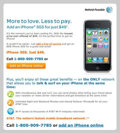 Hôm qua, AT&T đã gửi 1 email đến toàn thể những khách hàng đang sử dụng dịch vụ của mình, để quảng cáo iPhone 3GS chỉ có giá 49 USD kèm 2 năm hợp đồng sử dụng mạng AT&T.