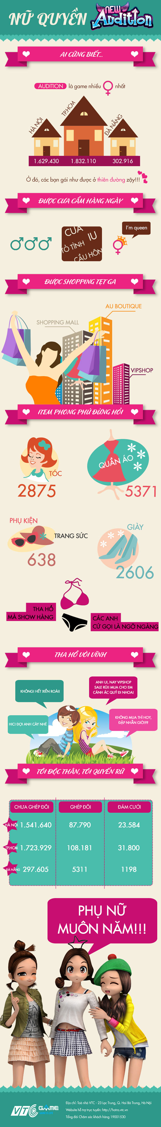 Là game âm nhạc vũ đạo luôn chứng tỏ được vị trí độc tôn của mình trên thị trường Việt Nam trong những năm qua, sở hữu lượng cộng đồng nữ game thủ đông đảo hơn bất cứ tựa game nào khác, không phải ngẫu nhiên mà Audition có được vị trí như vậy. Infographic với chủ đề 20/10 này sẽ bật mí những con số đáng kinh ngạc về những thú vui “xa xỉ” và thú vị mà tựa game này đang ưu ái dành cho phái đẹp.