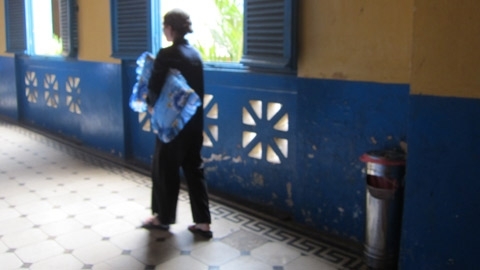Một bà cụ lọng khọng đặt bịch nylon lỉnh kỉnh với đủ thứ quạt giấy, quần áo, đồ dùng… xuống đất, tay kia khẽ bỏ cái gối ở bên rồi quay sang nhìn đứa con trai đang nằm bất động trên ghế bố.