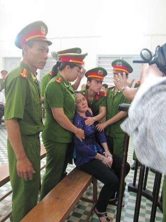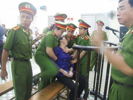Bị cáo Liễu luôn gục mặt trước vành móng ngựa, khóc nức nở. Có 3 cán bộ nữ và 2 cán bộ nam cảnh sát đứng cạnh bà Liễu để chăm sóc sức khỏe cho bà.