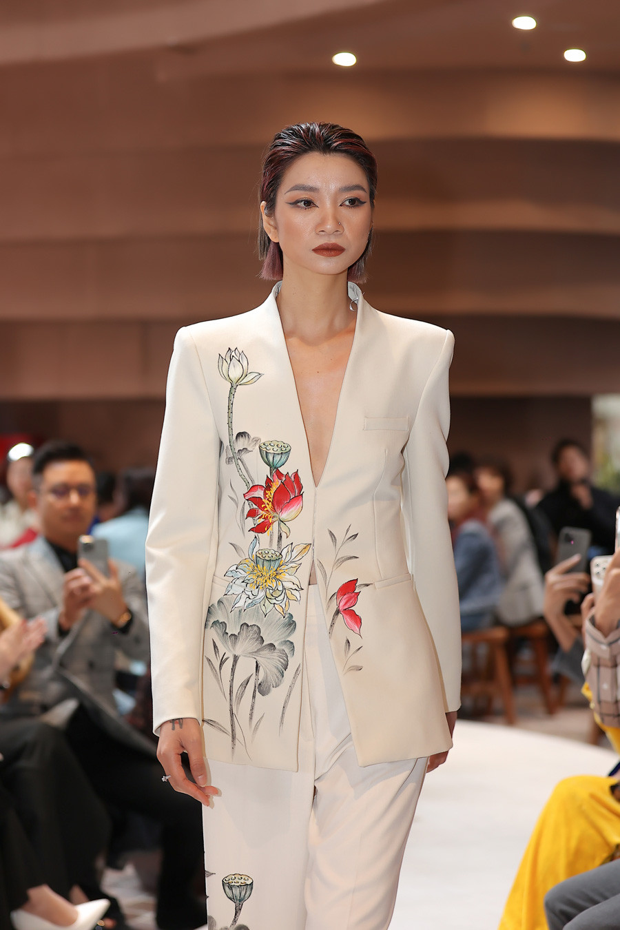 Sự phá cách thể hiện ở họa tiết thêu tay khéo léo làm điểm nhấn mềm mại cho từng bộ trang phục hay sự kết hợp giữa áo vest với quần ngố. Sự xuất hiện của người mẫu Hạ Vy và diễn viên Andrea Aybar với phong cách menswear trong vai trò “first face” và “vedette”khiến màn trình diễn thêm hấp dẫn.