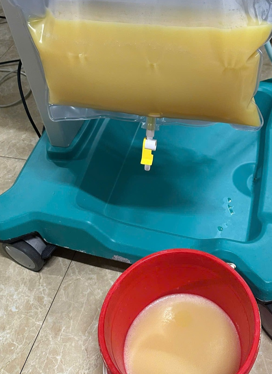 Trao đổi với báo VietNamNet, bác sĩ Lương Minh Tuấn, Phó giám đốc Bệnh viện Hùng Vương, cho biết ngay khi tiếp nhận người bệnh, ê-kíp trực đã nhanh chóng cấp cứu và tiến hành các xét nghiệm cần thiết. Chỉ số cholesterol là 28 mmol/l, triglycerid là 68,14 mmol/l gấp 40 lần người bình thường (1,7mmol/l). Ông G. được chẩn đoán viêm tụy cấp, nguy cơ tử vong cao và cần phải hồi sức tích cực, lọc máu liên tục. Các bác sĩ không thể tin nổi các túi, xô chứa dịch lọc của người bệnh đều là mỡ tách ra.