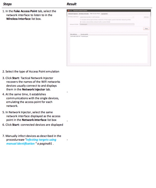 Sau đó, có nhiều điểm xâm nhập mạng được lập ra bí mật, các bộ cài đặt phần mềm gián điệp âm thầm chờ đợi bằng cách "giả mạo một điểm truy cập" WiFi miễn phí trong một khách sạn hoặc một cửa hàng Starbucks. Hướng dẫn Hacking Team cũng mô tả cách thức các phần mềm có thể triển khai các công cụ password-busting, để đột nhập vào mạng WiFi khép kín.