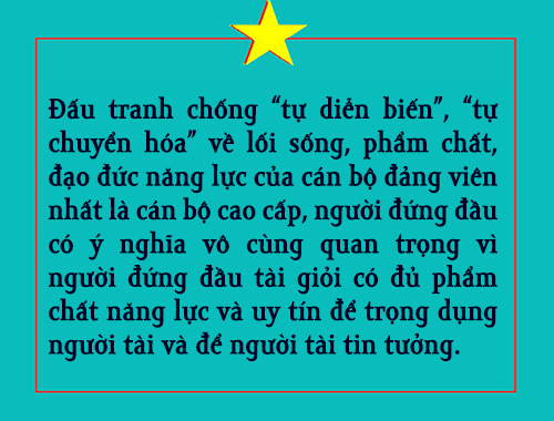 Đấu tranh chống “tự diễn biến”, “tự chuyển hóa” về lối sống, phẩm chất, đạo đức năng lực của cán bộ đảng viên nhất là cán bộ cao cấp, người đứng đầu có ý nghĩa vô cùng quan trọng vì người đứng đầu tài giỏi có đủ phẩm chất năng lực và uy tín để trọng dụng người tài và để người tài tin tưởng.