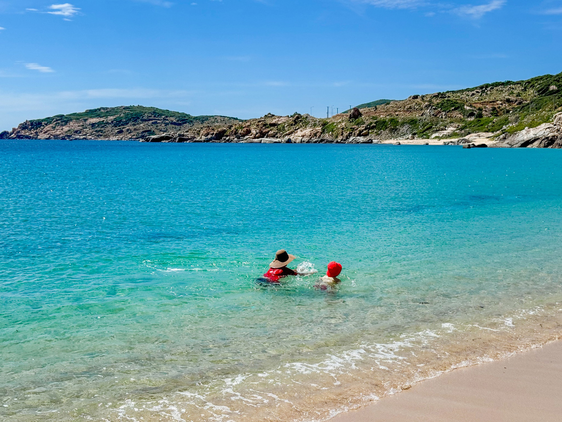 Để có thể chiêm ngưỡng khung cảnh biển tuyệt đẹp, gia đình anh Dũng di chuyển từ Bình Tiên đến bãi Chuối vào khung giờ trưa (10-12h). Thời điểm này nắng lên cao nhưng biển xanh ngắt, nước trong, nhìn thấy đáy.
