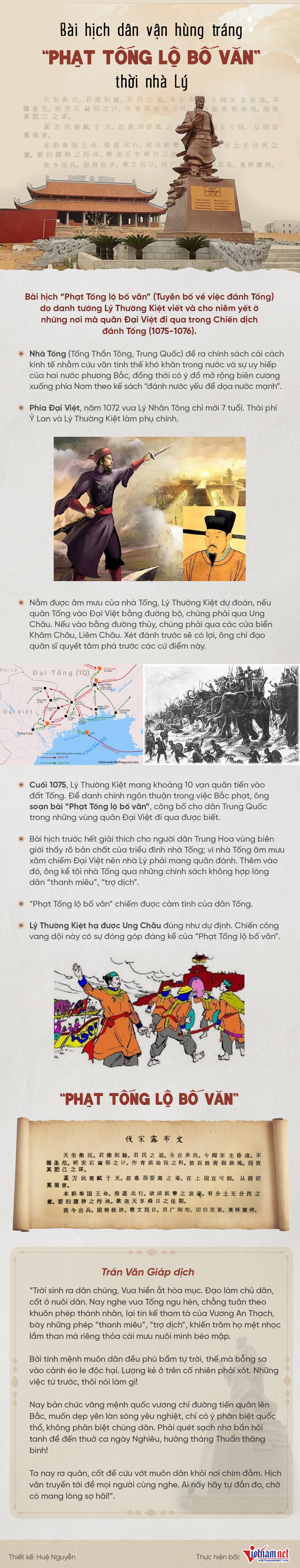 Bài hịch dân vận hùng tráng “Phạt Tống lộ bố văn” do danh tướng Lý Thường Kiệt viết và cho niêm yết ở những nơi mà quân Đại Việt đi qua trong chiến dịch đánh Tống (1075-1076).