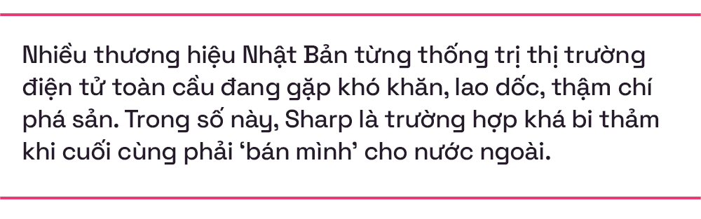 Sharp dần rơi vào suy thoái. Họ cố gắng cạnh tranh khi tung ra các mẫu TV với màn hình lớn hơn nhưng không thành công. Niềm hy vọng người tiêu dùng nội địa sẽ mua TV nội địa, kể cả đắt tiền, cũng tan biến khi không thể cạnh tranh bằng giá. Dù được chính phủ Nhật Bản công nhận là thương hiệu quốc gia, thực tế với Sharp rất khắc nghiệt.