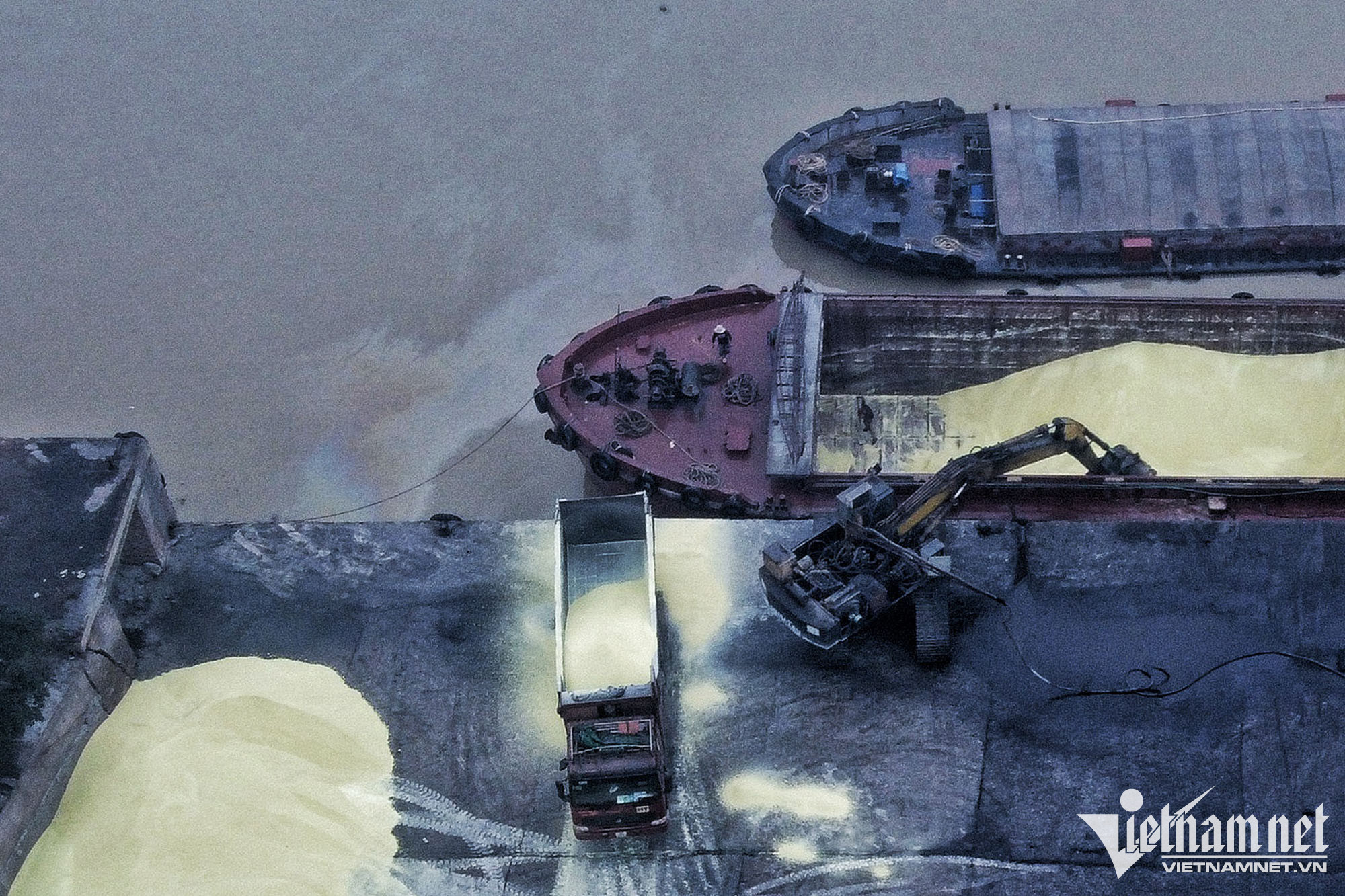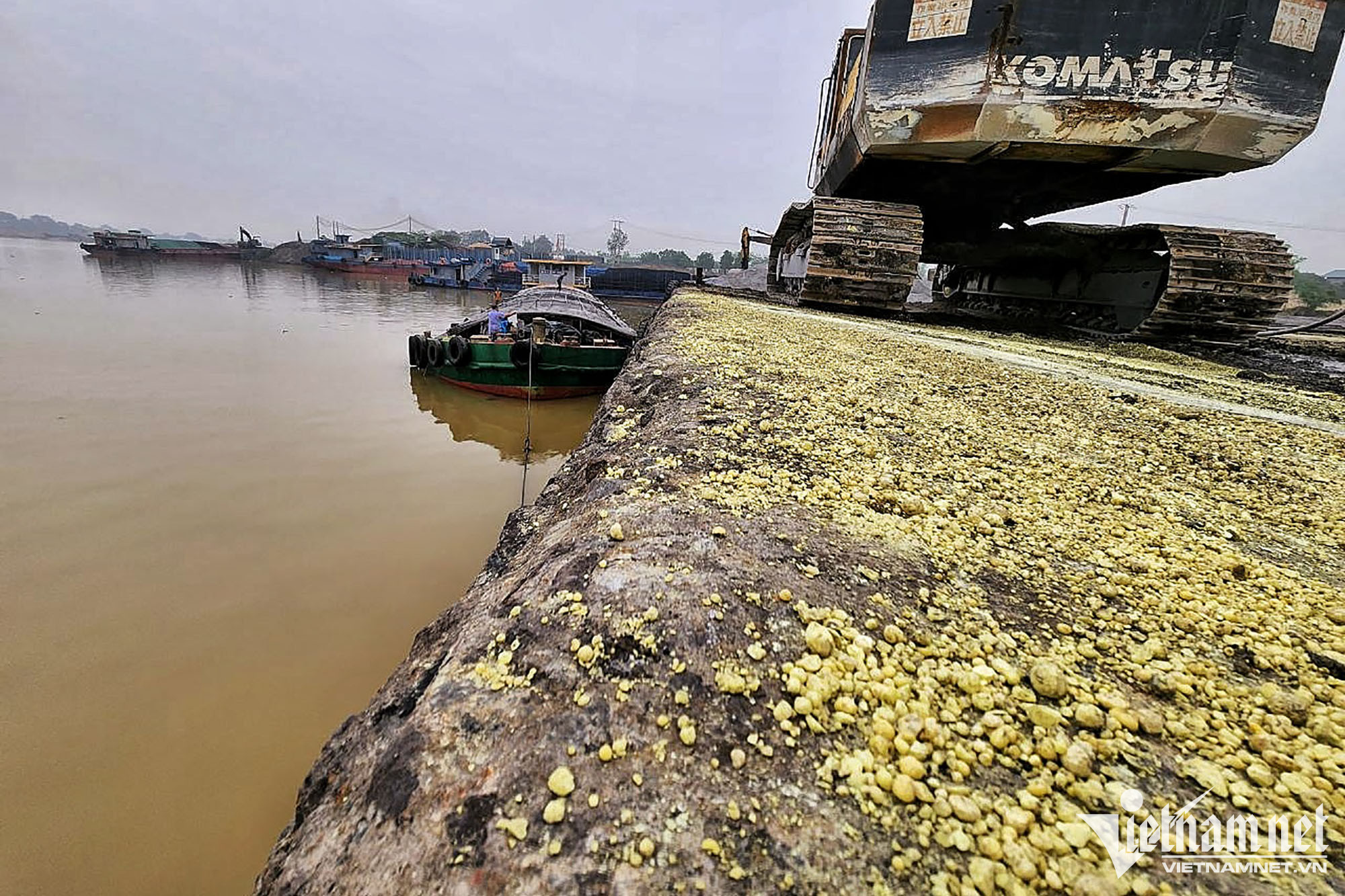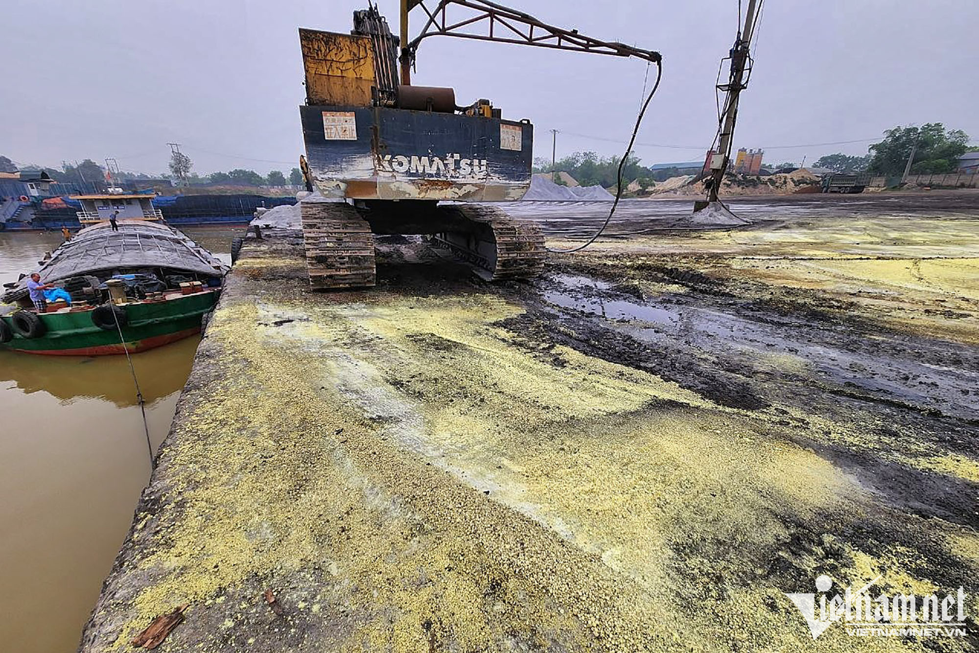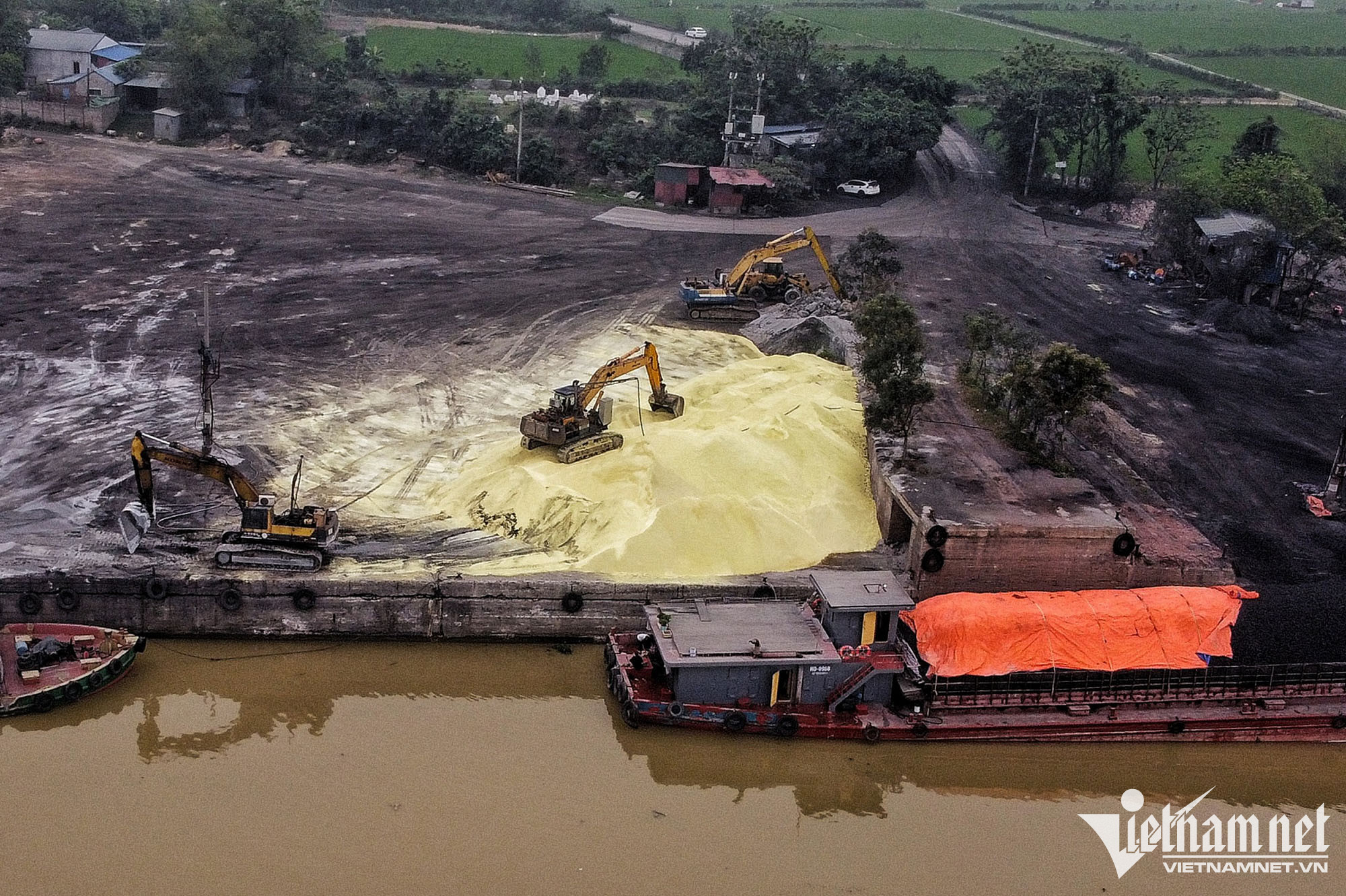 Bãi lưu huỳnh được bốc xếp lên cảng ngày 15/3. Ảnh: H.NBãi lưu huỳnh chất lộ thiên ven sông Cầu chiều 31/3. Ảnh: Đoàn Bổng