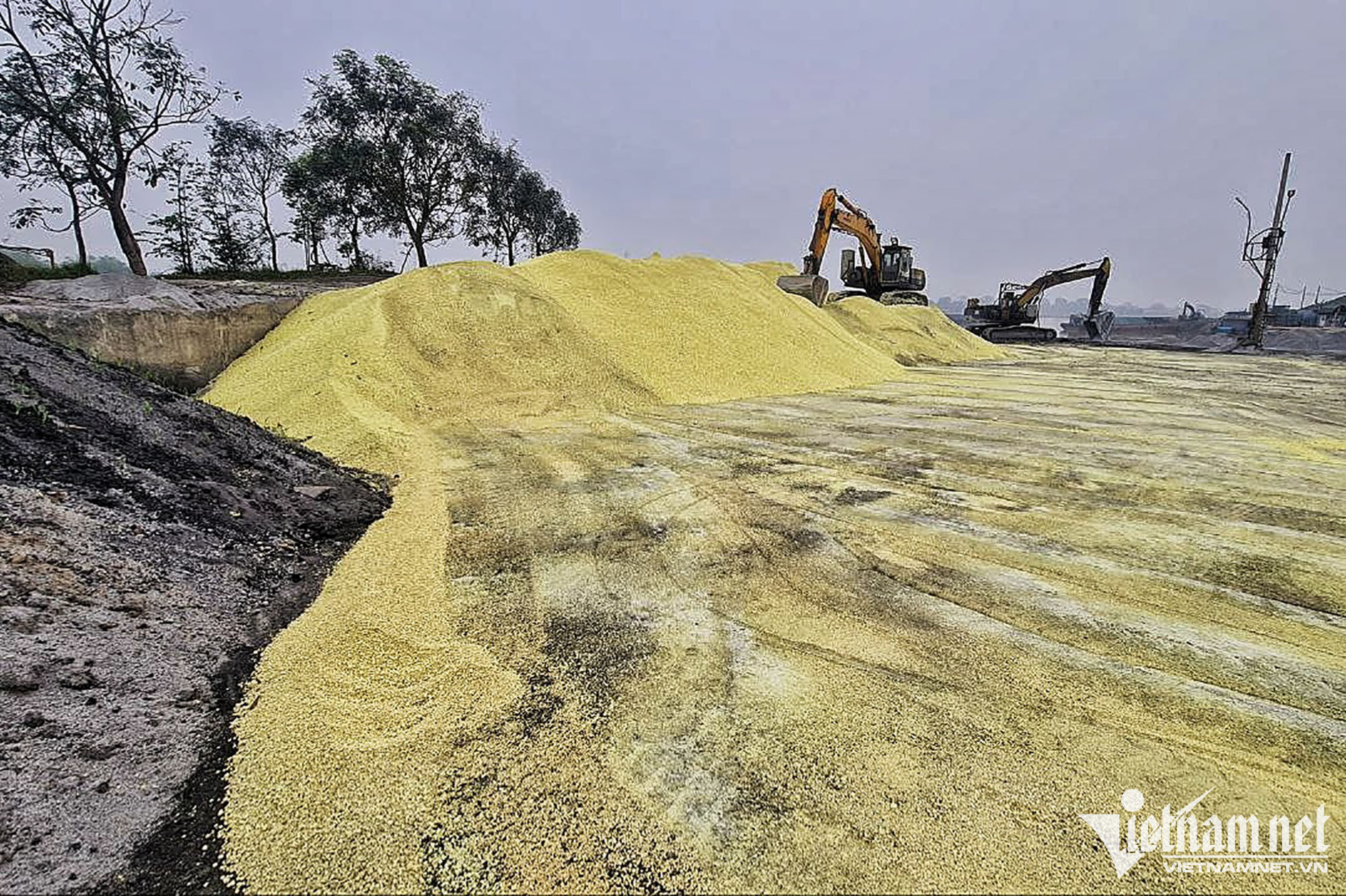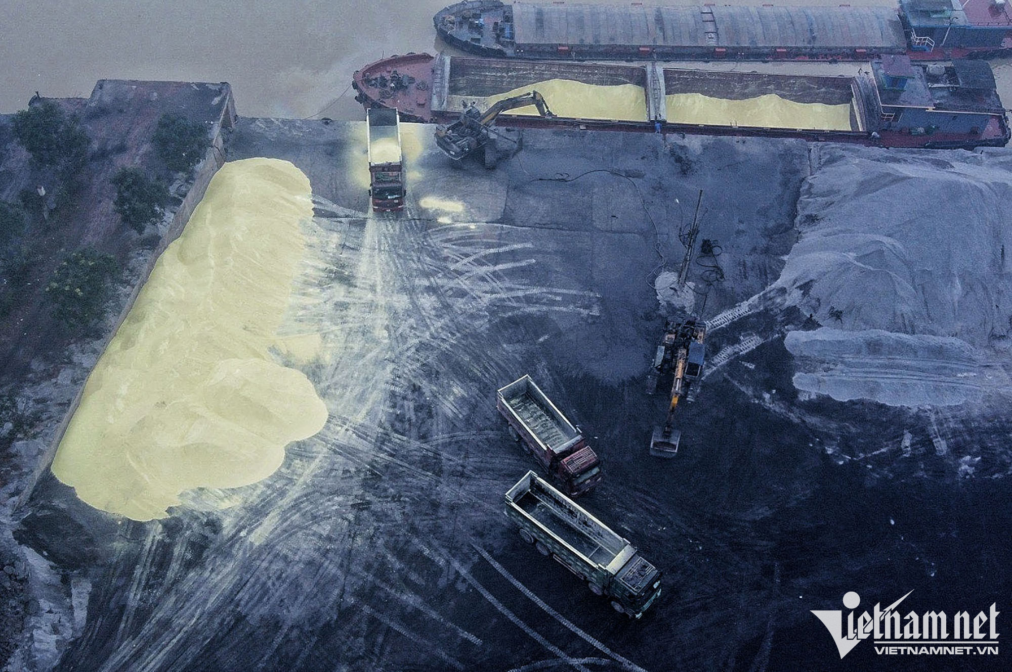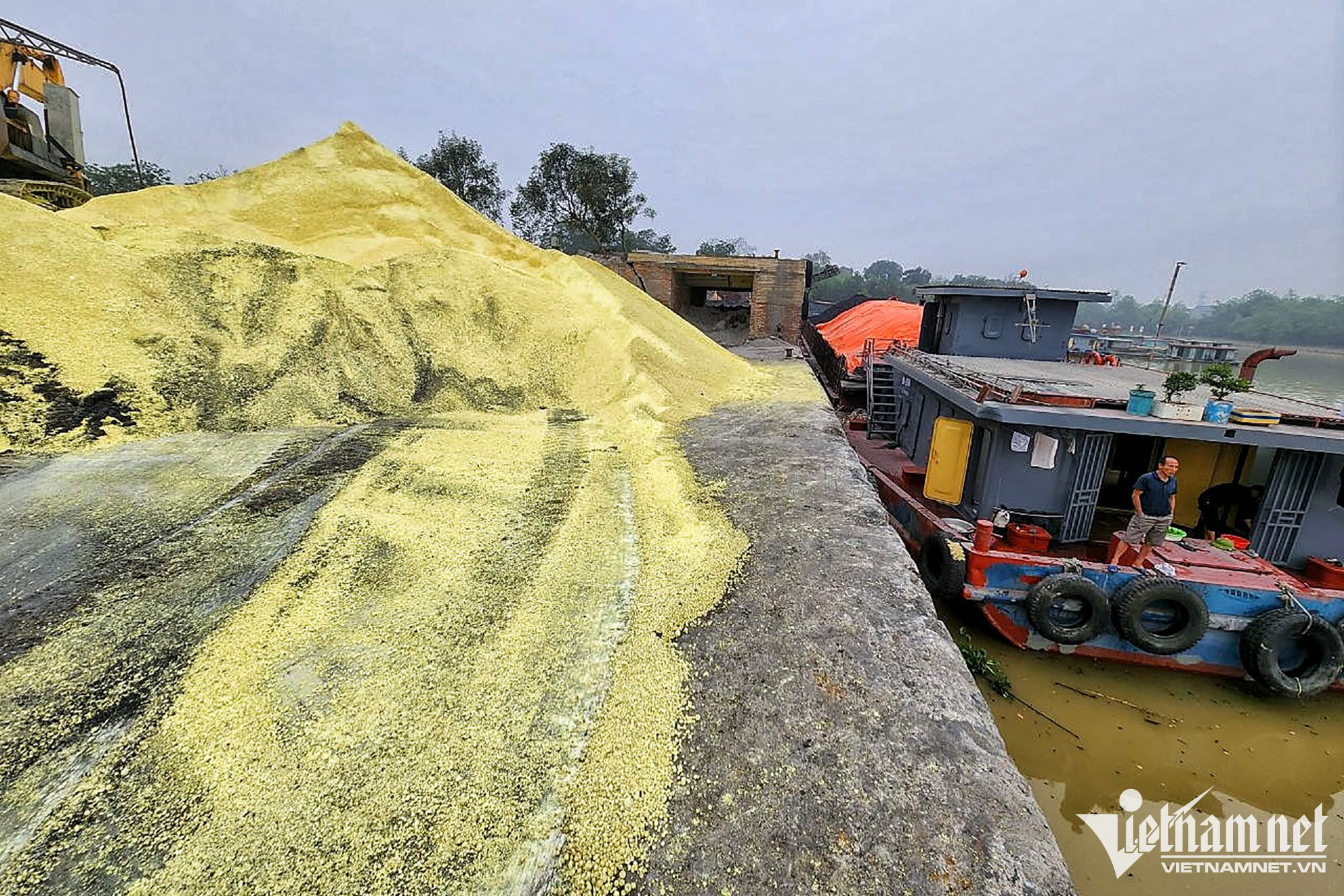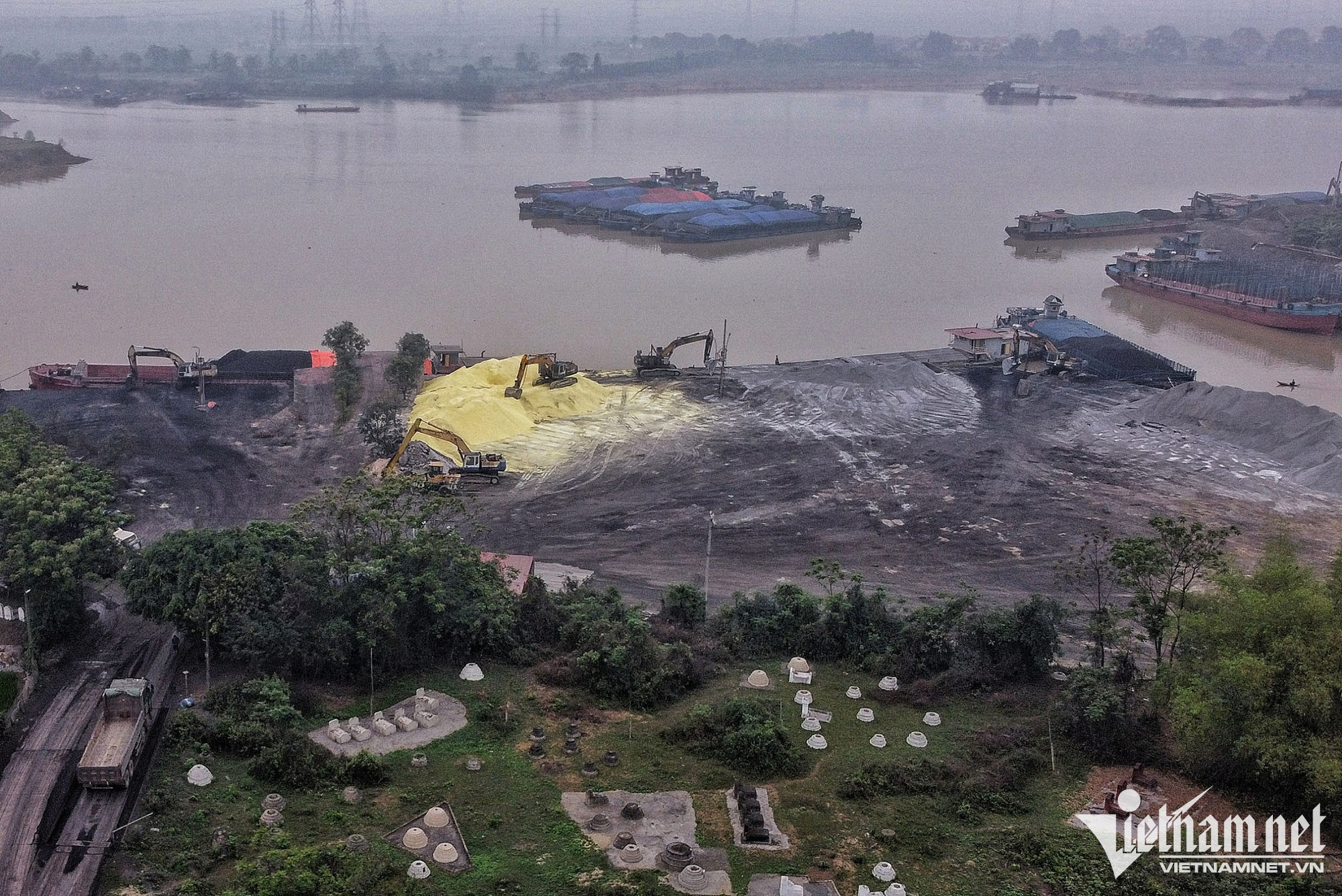 Bãi lưu huỳnh được bốc xếp lên cảng ngày 15/3. Ảnh: H.NBãi lưu huỳnh chất lộ thiên ven sông Cầu chiều 31/3. Ảnh: Đoàn Bổng