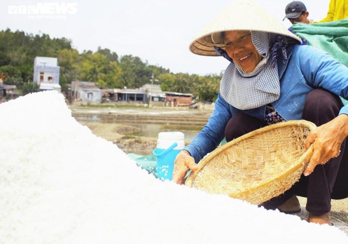 Trải qua khoảng thời gian 1,5 tháng vào vụ, bà con vui mừng khi sản lượng muối đạt năng suất cao. Do đó, nhiều diêm dân như bà Nguyễn Thị Vân (thôn Long Thạnh) túc trực cả ngày lẫn đêm ngoài đồng để thu gom muối.