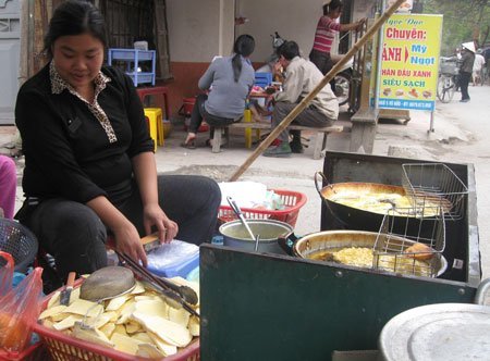 "Nhiều khi chị không rán kịp để bán. Buổi sáng đi chợ về tách ngô, bổ khoai chuẩn bị bột và đến 2h chiều chị mang đi bán. Có hôm khách đặt cả trăm cái làm không kịp. Lúc thưa khách, chị rán bánh ủ vào trong một chiếc thùng cho bánh giòn và nóng nhưng vẫn không đủ bán lúc khách đông" - chị Yến hồ hởi.