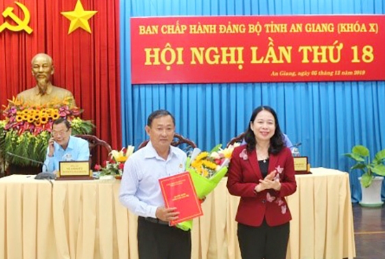 Ủy viên Trung ương Đảng, Bí thư Tỉnh ủy An Giang Võ Thị Ánh Xuân trao quyết định và chúc mừng ông Nguyễn Tiếc Hùng |