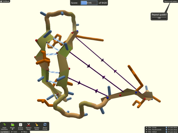Koepnick giải thích về luật tính điểm của Foldit, trong đó, "bạn sẽ thay đổi hình dạng của mô hình protein để tối ưu hóa điểm số của bạn. Điểm số này thực sự là một tính toán phức tạp đại điện cho thế năng của gấp nếp".