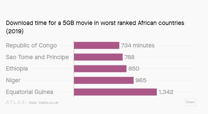 Thời gian để tải một bộ phim 5GB tại những quốc gia châu Phi có mức độ xếp hạng tốc độ Internet tệ nhất |